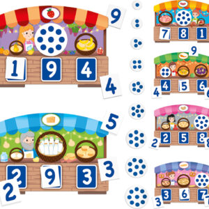 In an entertaining little market, an engrossing game of touch bingo! Thanks to the emery-polished tokens and to the progressive counters from 1 to 9, children can complete their own cards with the numbers and quantities, thus learning to make their first sums.