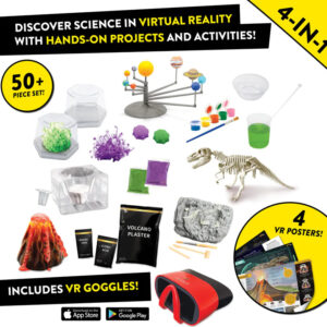 Dig out a 14″ T Rex fossil, assemble a planetarium model, build and erupt a volcano, and even grow your very own crystals! This mega science pack bundles four of our top selling STEAM kits into one, bringing dinosaurs, crystals, our solar system and volcanoes all under one roof! Then put on the included VR goggles to experience dozens of immersive environments and come face to face with these geological wonders like never before!