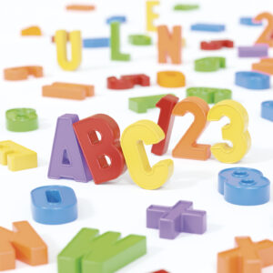 48 letters, 48 magnetic numbers and 10 magnets to compose the first words, to do the first operations or to write colorful messages on the refrigerator door or on any metal surface.