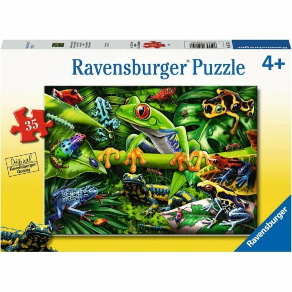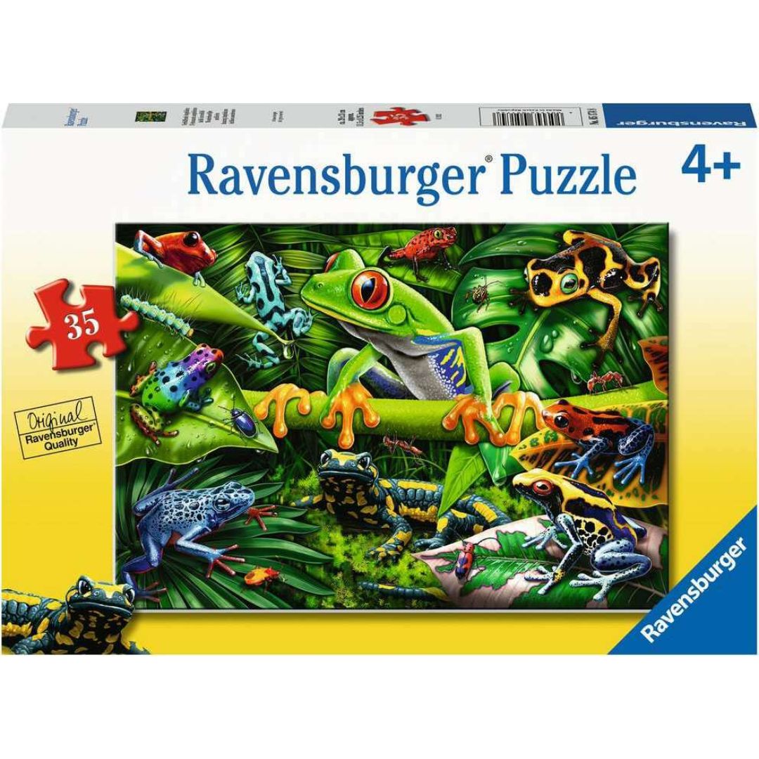 Did you know a group of poison frogs is called an army? They measure from less than 1.5” to almost 2.5” long. Some of the species here include: blue poison dart (bottom left), red striped poison dart frog (right side) and a dyeing dart frog (bottom right). The red-eyed tree frog (center) has large suction-cup pads to climb and cling to branches and leaves. And if a predator grabs a fire salamander (bottom center) by its tail, toe or leg, it can break off that limb and grow a new one to replace it! This 35-piece puzzle has extra-large, durable pieces little hands can easily hold on to for lots of repeat fun. Clean-cut pieces and Ravensburger’s tight interlocking fit provide a pleasurable puzzling experience for children and their adult helpers alike. With piece counts children can grow with, our Perfect Age Fit criteria ensures this puzzle is fun and educational for ages 4 and up!