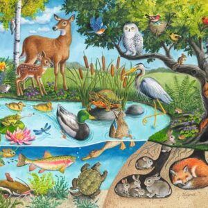 Come visit this lovely woodland pond and make friends with the “Animals Above and Below”! Our nature puzzle features woodland and water creatures like birds, deer, owls, racoons, squirrels, fish and turtles. Underground, a family of rabbits rest in their burrow while a red fox sleeps in its den. Did you know Burrowing Owls hunt by day and sleep underground? Puzzles help develop hand-eye coordination, fine motor skills and problem-solving through repeated practice and lots of screen-free fun!