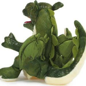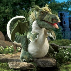 Sitting on his rump, tail curled and reaching for Mom, he may look harmless, but watch out! This BABY DRAGON puppet is a fierce creature in training. Animate his arms and mouth and he’ll light fires in your heart. Fashioned in scaly textured fabric with satiny wings, the Baby Dragon puppet measures 8.5-inches tall.