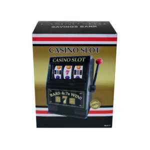 6″ tall with working handle, separate bank and jackpot coin slots, and manual coin release. No batteries required.