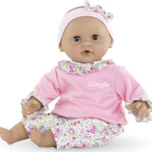 Bébé Calin Maria is an ideal first baby doll for ages 18 months and up. At 12″ tall, Calin Maria is the right size to be cradled in a young child’s arms. She has a cuddly soft, poseable body, brown sleeping eyes, and her head and limbs are made of soft-to-the-touch vinyl that is delicately scented with vanilla — a Corolle signature.