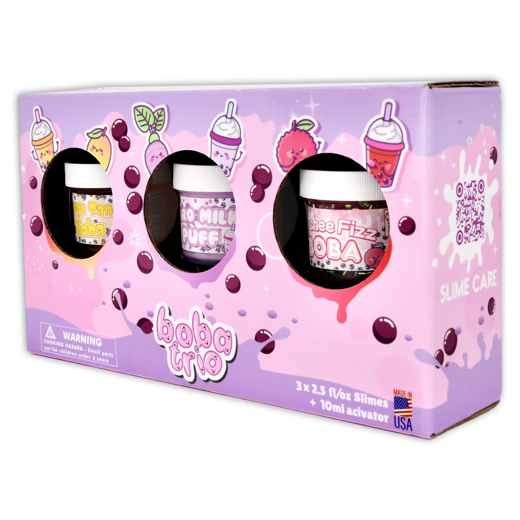 It’s any boba lovers fidget dream with the boba slime trio. This pack includes three boba themed 2.5 fl/oz sample size slimes for a total of 7.5 fl/oz of slime: