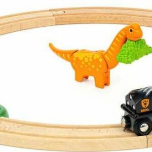 Roar! There’s a dinosaur on the track in the 36098 Dinosaur Circle Set. This 12-piece dinosaur-themed train set includes a train with wagon, dinosaur figure, grassy meadow crossing and wooden tracks to complete the circle layout. Be careful as the train approaches the crossing as this colorful dinosaur loves to eat the leaves from the tree. Use its tail to raise and lower the dinosaurs head, then grab accessories with the classic BRIO magnet.