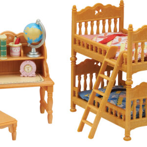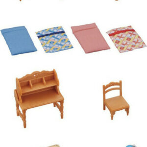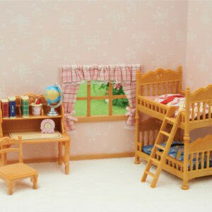 Books and a globe come included, and the globe can be spun around. The shelving on top of the desk can be removed to create a more simple desk. Bed x2, Ladder, Mattress x2 (Blue, Red), Bedding x2 (Blue, Red), Child’s Desk, Chair, Shelf, Mat, Pencil, Red Pen, Pen Stand, Desk Clock, Book x3, Globe (a total of 19 pieces)