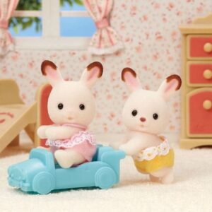 The Hopscotch Rabbit Twins set includes the Hopscotch Rabbit twins figures (one sitting and one crawling) and a ride-on toy. The figures can be posed by moving the head.