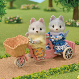 Here’s a perfect addition to the role-playing world of Calico Critters. Two poseable puppies on a tandem bicycle, compatible with other Calico Critter sets. Pauline Husky and Hayden Husky come dressed in removable costumes, ready to join the caring Calico Community where imaginations soar.