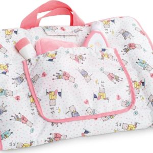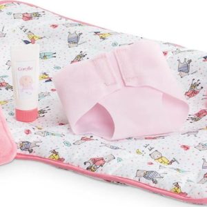 Corolle’s Changing Accessories Set has everything make-believe moms and dads need for their 14- to 17-inch Corolle baby doll at changing time: lotion, baby wipe and holder, tube of cream, cloth diaper, and changing mat that does double-duty as a carry bag, complete with storage pocket. From Corolle for ages 2 and up.