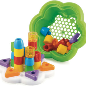 Help developmental skills and creativity blossom with this peg-based construction toy for babies and toddlers. Created with soft, safe materials and big rounded shapes, each chunky peg is easy for small hands to grasp, stack, and place. Curious kids enjoy open-ended play as they fill the holes in the daisy-shaped board or stack them to build all sorts of colorful towers. Includes 26 colorful pegs, 1 flower-shaped board, and 1 flower-shaped bucket.