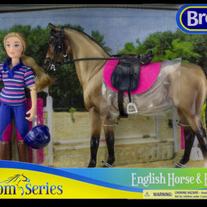 This lovely English rider is casually dressed for a lesson on her beautiful bay roan horse! Includes: 6″ articulated rider, horse, saddle pad, English saddle and bridle