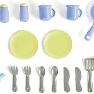 22 piece set including pots, pans, plates, cups and more for pretend kitchen play! Fill the teapot with water and pour it into the cups. Coordinated appearance for play with Trendy Kitchen Trio.