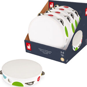 CONFETTI TAMBOURINES with cymbals. Red, yellow, green, orange… Confetti, a complete line of musical instruments featuring Pop N’ Rock designs ! Confetti awakens all of the senses and introduces the youngest musicians to the joys of musical improvisation. Toy made of wood (plywood) and metal. Printing: standard painting and silk-screen.
