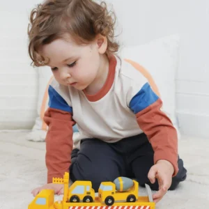 It’s a transporter for the construction vehicles! A cement mixer and heavy lifter are being transported to a new building site! Trailer is detachable from the front cabin allowing extra play. Great for adding to our construction set and good for imaginative play.