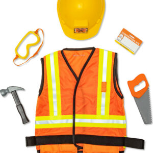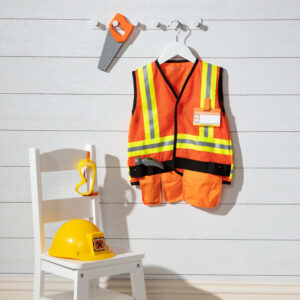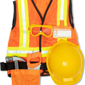 Work zone ahead! Your little construction worker will be ready for the job with this bright orange, machine-washable, vest high-lighted with reflective material and a tool belt, a yellow hard hat, goggles, a hammer, a saw, and a name tag for personalizing.