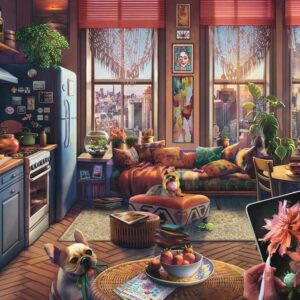 Breathe some free-spirited, creativity into your world as you relax with this “Cozy Boho Studio” puzzle! Imagine yourself in this comfy bohemian artist retreat in the heart of New York City, sipping a lovely cup of tea with refreshing lemon. Baxter is patiently waiting for his walk as soon as you take a break from your digital drawing. Perky Peppa is ready to play keep-away, or join in the jaunt. With loads of delightful details to enjoy, good vibes await with every piece of puzzle fun!