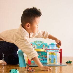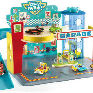 Start your engines for whimsical imaginative adventures! This gorgeously designed wooden garage is a gift that wows! Bursting with charm, it’s equipped with exciting features: a lift that raises cars to the top level, a ramp for a thrilling exit, colorful storytelling illustrations, and detachable accessories like rollers and electric charging stations. From tune-ups to quick getaways, the Crazy Garage is the ultimate play set for little ones who love cars and creativity. Make sure to add several silly Crazy Motors Cars to your cart, none are included with this 12.6″ x 15.7″ x 10″ garage.