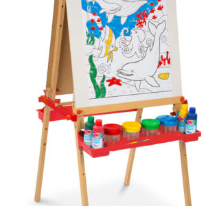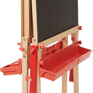 Help spark creative expression in your budding artist with this generously sized, deluxe wooden easel featuring both a magnetic chalkboard and a dry-erase board. The removable plastic trays mean that kids have loads of easy-reach art supplies (not included) at their fingertips. Plus 39 letter and number magnets that are great for extended play!