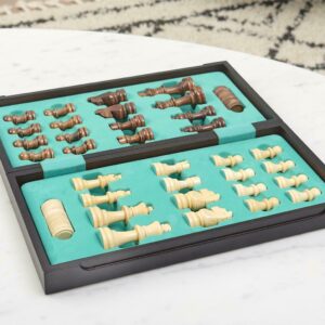 TWO GAMES IN ONE DELUXE PACKAGE: With this deluxe set, you will receive two classic games- chess and checkers. Both games can be played with the same deluxe wooden gameboard, just with different pieces. You can rely on these chess and checkers pieces to stand the test of time. With 32 chess pieces and 24 checkers pieces included, the smooth wooden texture and shine are surely something to brag about. Â Take your chess and checkers with you anywhere- to family game night or to a dinner party with friends. This gorgeous wooden foldable gameboard will protect your pieces, all while looking pristine.