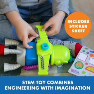 Robot designers, welcome to your lab. Customize your robots by mixing and matching pieces. With over 70 pieces included, kids ages 3+ can mix and match to create hundreds of combinations. Pick your pieces, then use the kid-friendly tools to assemble your robot, then take it apart and do it all over again! Encourage creativity and imagination with pretend play. This STEM toy introduces early engineering, fine motor skill development, and problem-solving. Includes kid-friendly drill, Phillips bit, screwdriver, gear socket bit, 32 bolts, 26 interchangeable pieces, seven gears, and sticker sheet. Requires 2 AA batteries (not included).