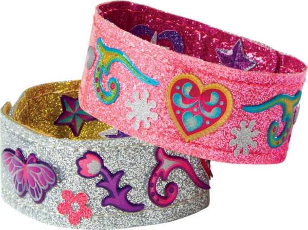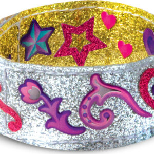 This exciting fashion activity set and bracelet craft kit lets kids make their own accessories to wear and share! The set includes four two-sided kids’ bracelets, with a different shimmering color on each side. Just add the included sparkle-gem and glitter stickers to fill each one with flowers, hearts, butterflies, stars, loops, and swirls. Make your own bracelets, then close the reusable tab closure to wear your favorite–or layer a bunch for a sparkling fashion statement!