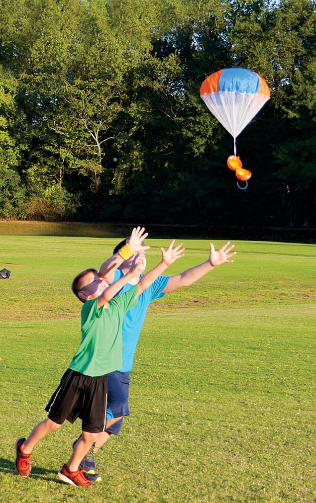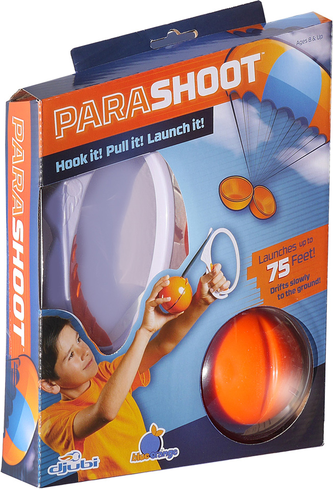 Using the futuristic-looking Djubi launcher, kids can launch the parachute ball up to 80 feet into the air. The ball has a built-in timer. As it reaches the peak of its flight, it automatically opens up and releases the parachute.