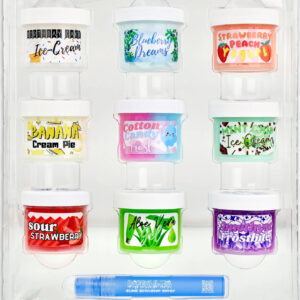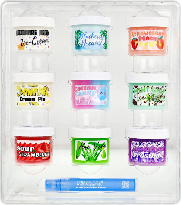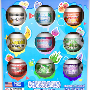 This pack includes nine unique textured 2.5 fl/oz sample size slimes for a total of 22.5 fl/oz of slime: