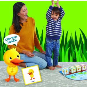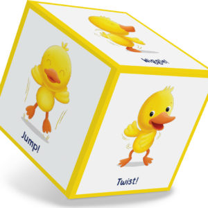 Get moving and grooving with this fun dancing game for toddlers! Duck Duck Dance! is simple and sweet, with 4 large dice featuring 8 different easy dance moves. From spinning to wiggling, players imitate the adorable ducks to uncover the 4 audience members to complete the game! All 2+ games include a parent guide with tips for adapting the game to your child’s age and skill level, as well as fun twists to play the game in new ways!