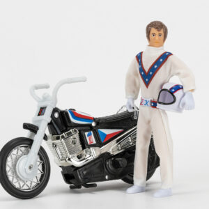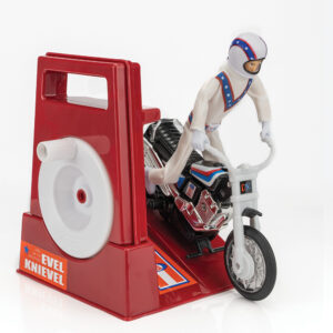 Embrace 1970’s nostalgia with a new and improved version of the classic super-powerful wind-up gear stunt bike! The Evel Knievel Stunt-Cycle Toy is faster than ever with an enhanced gear system and can jump a ramp anywhere between 3′-10′! Now with upgraded flexible handlebars, a Sport Blue launcher with Evel signature branding, and new no-slip helmet. Kids AND adults will love trying stunts and watching Evel zip by at blazing speeds.