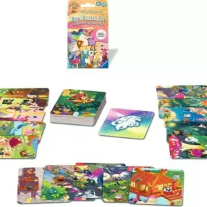 57 hidden object cards show funny scenes in the realm of fairy tales. In each round, a hidden motif is revealed. Everyone searches for it simultaneously on the hidden object cards in front of them. Whoever discovers it first may place the card upside down in the center. The back of this card shows the new search motif and the game continues immediately for everyone. In this turbulent card game, the first person to get rid of their five cards wins.