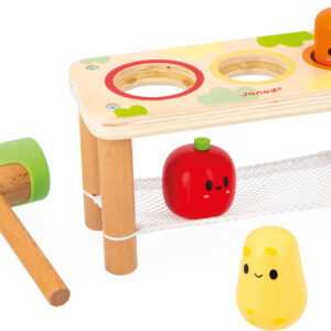 It’s harvest time, so have fun making the vegetables fall into their net! The toy consists of a stand with a net, a tomato, a potato, a carrot and a wooden hammer.
