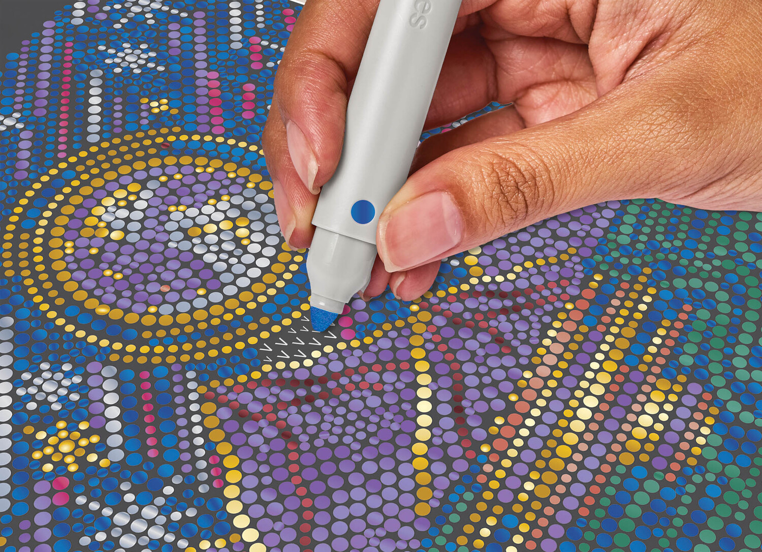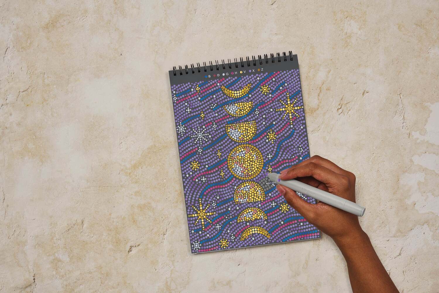 Dot-by-Letter Metallic Ink – Into the Galaxy includes 20 meditative cosmic scenes and four double-sided markers (8 colors) in a detachable storage tray. Use the guided letter key to fill each page with metallic dots, creating beautiful space scenes and letting the rhythmic motion of dotting bring you a sense of zen.