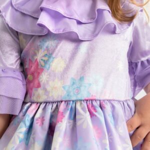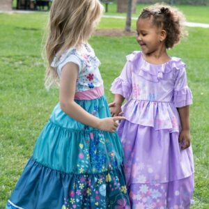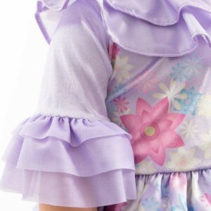 Charming, beautiful, and adorable all wrapped up into one dress, the magic of this dress is something you have to see to believe! Soft lilac stretch velvet bodice with bright flowers. French inspired 3/4 length, flowing sleeves. China silk skirt with trailing floral pattern. Breathable, Silky Soft, 100% Polyester Fabrics