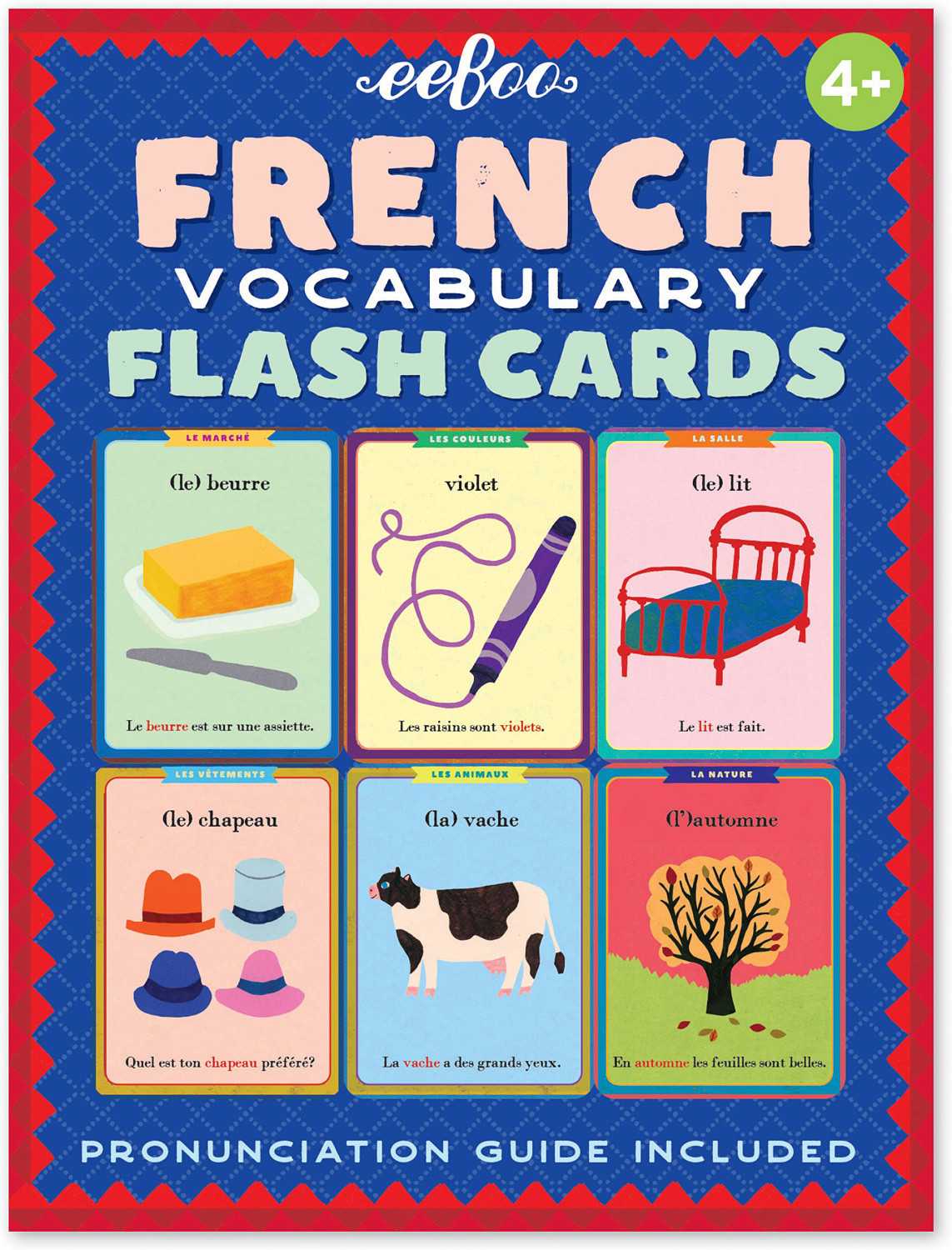 These cards introduce French with eight basic vocabulary words in each of seven categories: nature, vehicles, market, animals, clothing, colors, and home. Each card is printed with the word, an illustration of the word, and the word in a sentence. In French on one side of the card and in English on the reverse. Directions as well as suggestions for using the cards as starting points for storytelling and play acting, and honing categorization skills are included. Illustrations by Monika Forsberg.