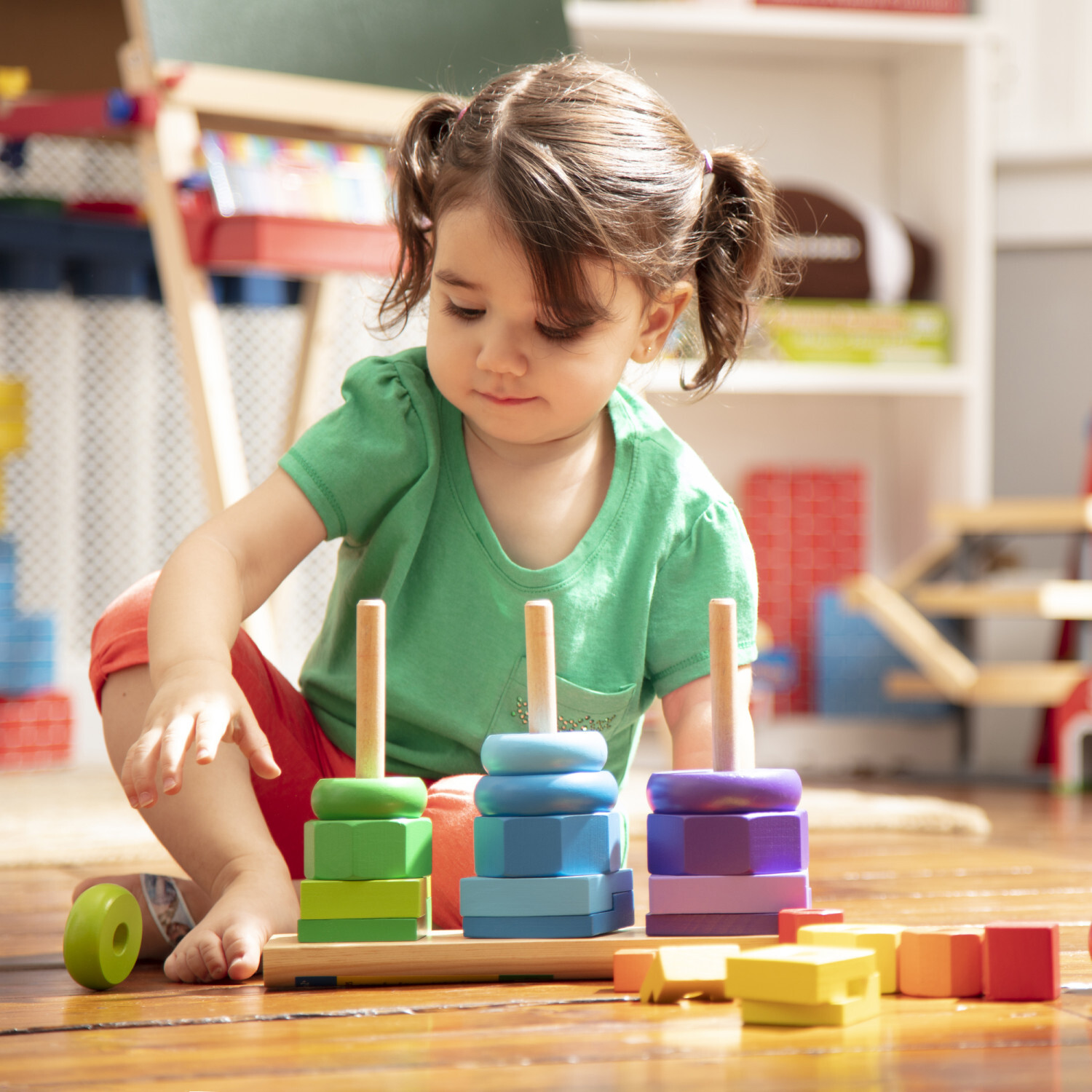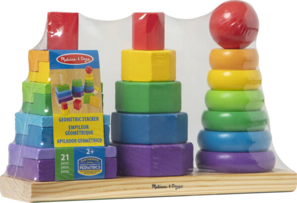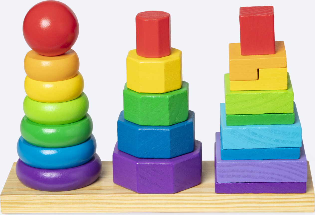 | Features | 25 colorful wooden pieces to match and stack on three rods Rings, octagons, and rectangles 2+ years |