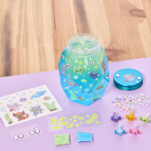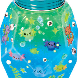 The Creativity for Kids Glowing Axolotl Aquarium includes a fun-shaped container, 5 axolotl figurines, glow bubbles, glow stickers and fun accessories.