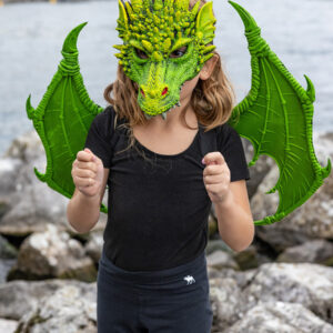 Fire up imaginary play in fantastic worlds of wonder by adding these beautifully designed dragon wings to your child’s dress-up collection. They’re made from high-quality, rubberized foam, making them comfortable for hours of wear and durable for years of pretend play. The texture makes it feel like real dragon scales! Features wide elastic shoulder straps for a snug and secure fit during running, jumping, and playing to keep your little dragon safe while still looking fierce. Pair with green dragon mask and tail for a complete costume! Each sold separately.
