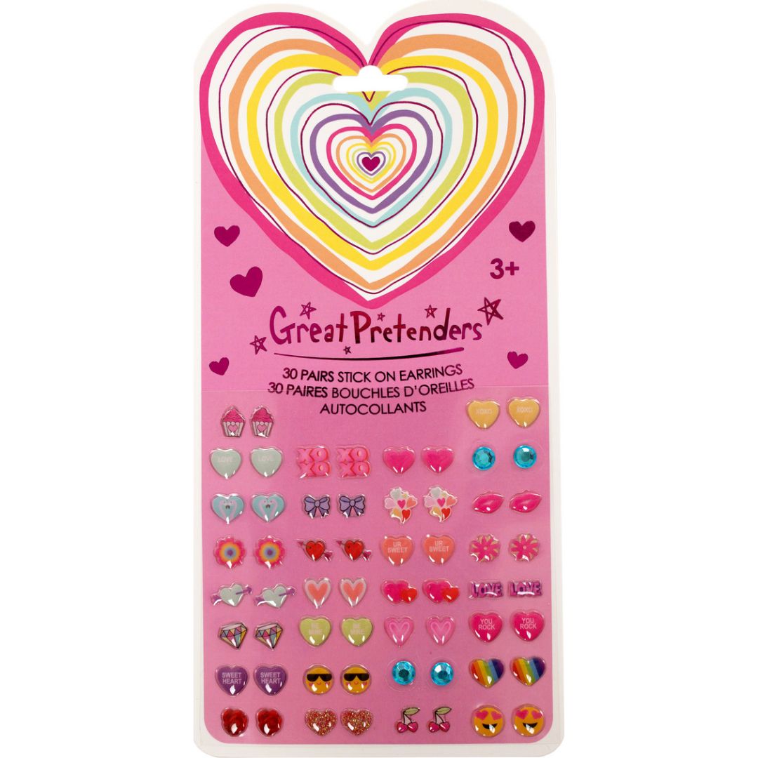 30 pairs of stick-on earrings! A different pair every day of the month. Achieve the pierced ear look without having your ears pierced with these amazing Valentine-themed earrings. These earrings are the perfect way to express your love for someone special.