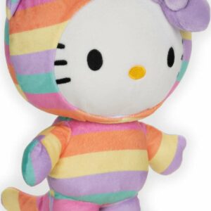 Hello Kitty, the internationally loved character from the world of Sanrio, is a kawaii little girl with an iconic bow who loves making new friends and having fun! Hello Kitty loves to dress up in adorable outfits like this striped, pastel rainbow onesie, which she has pulled over her head with a matching purple bow. This adorable and soft 9.5-inch standing plush features Hello Kitty with high-quality embroidered facial details and an extra kitty face on the outfit’s hood.