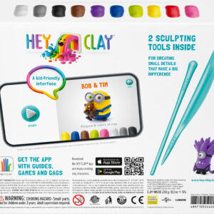 Spheres, cylinders, facial features, textures, and more… Kids learn real sculpting techniques without even realizing it! Bring your own villainy adventures to life with the Hey Clay Minions set. Hey Clay Minions High-quality clay and interactive app for molding 6 Minion figurines Encourages fine motor skills, spatial reasoning, creativity.
