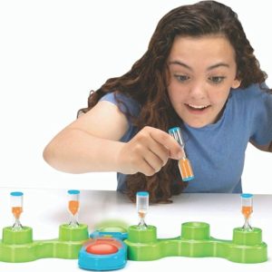 Set the clocks to however long you want the game to last. Then, press your button to start your clock before flipping all the sand timers over. Using one hand, you’ve got to keep the sand flowing by flipping and moving the sand timers to an empty space, one at time. Stay focused and move fast… The instant a sand timer runs out, your opponent gets to hit their button to stop your time and start theirs before jumping right into the sand-flippin’ action. Whoever runs out their clock first wins! 2 players. Ages 8+