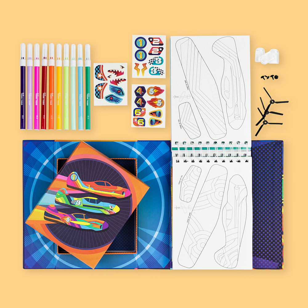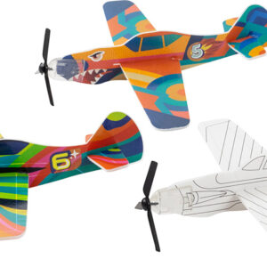 Color, build and play with this all-in-one set for kids who love airplanes! Creative kiddos pop out the plane pieces and decorate them using the included stickers and markers. Visions of adventurous flights emerge as they add propellers and slide pieces together to construct the lightweight, durable planes. Then it becomes a game: lay the large target sheets on the ground, take aim, and earn points! Fun for solo or collaborative play. Includes 6 pop out foam planes (3 full color and 3 outlined), 6 propellers, 6 protective nose cones, 3 sticker sheets, 10 vibrant markers, 4 large target sheets all in one convenient case.