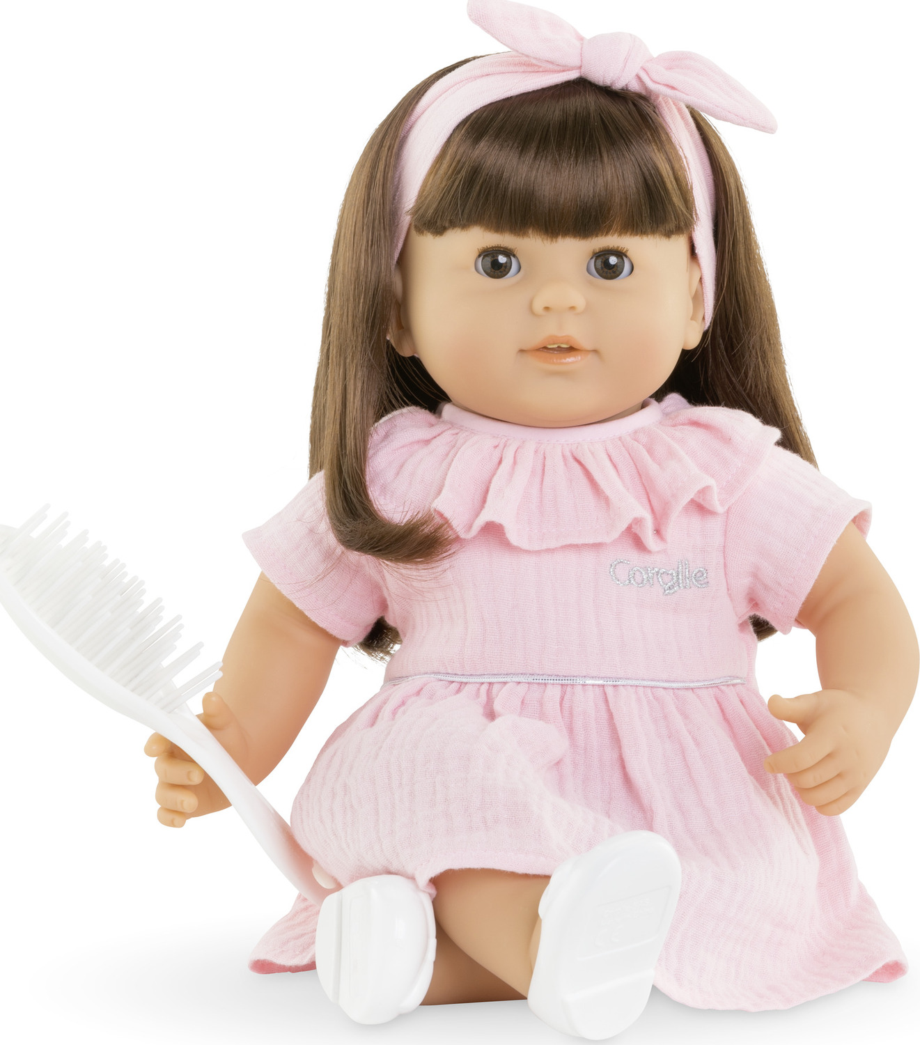 Julie is a 14-inch, soft-bodied baby doll with long brown rooted hair to introduce ages 3 and up to hairstyling play (hairbrush included). Julie has brown sleepy eyes and a weighted bottom so she can sit up by herself. Her head and limbs are made of soft, supple vinyl that is delicately scented with vanilla, a Corolle signature.