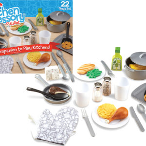 Play time will heat up with this perfect companion set to play kitchens! The 20-piece set includes a pot with lid, frying pan, cookie sheet, spatula, serving spoon, two plates, two cups, two forks, two knives, two spoons, and a timer, all made of durable plastic that are top-rack dishwasher safe. There are also wooden salt and pepper shakers, a wooden olive oil bottle, a dish towel, and an oven mitt. Budding chefs three and older will be able to cook and serve up imaginative fun for years to come with this kid-sized cook set.