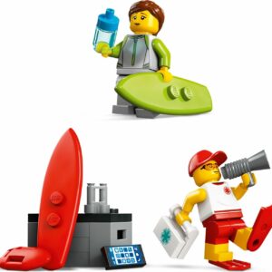 - LEGO® truck toy with fun accessories – This kids’ playset comes with accessories, including 3 surfboards, 2 rescue buoys, flippers, binoculars, a megaphone, water bottle, phone and first aid kit