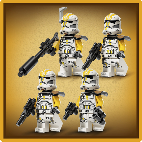 - 4 LEGO® Star Wars™ minifigures – 4 327th Clone Troopers with a blaster pistol, 2 blasters and a blaster rifle, plus 3 Super Battle Droid LEGO figures