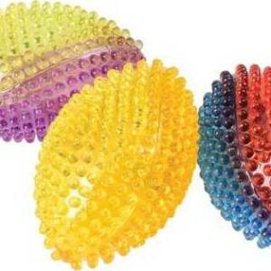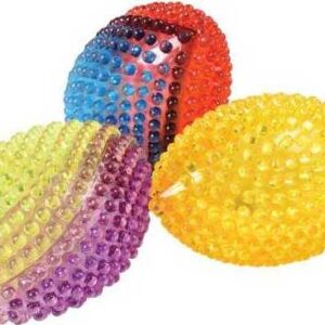 Translucent colorful balls have knobby texture and light up when bounced. Made of plastic. Item 5″