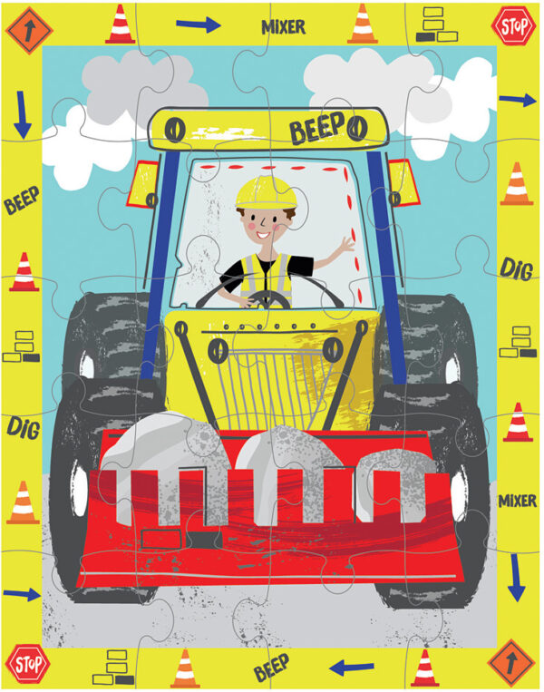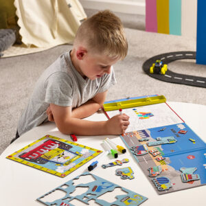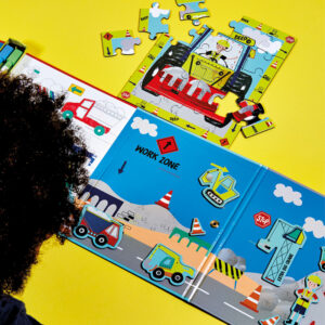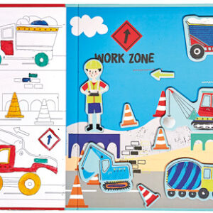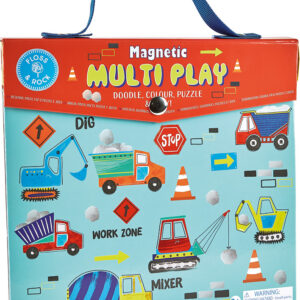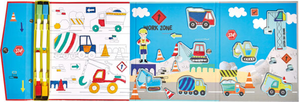 Travel entertainment at its best: doodle, color, puzzle, and play, all in one fold-out kit! The magnetic construction play scene opens up to reveal a 20 piece tractor puzzle, 4 color dry wipe pens with erasers, pop out work zone play pieces, and a dry erase doodle and color section. Everything is magnetic, so no chance of losing pieces during bumpy road trips or rough air. The high quality fabric handle, snap closure, and clever 9″ x 9″ x 1″ design make this a top pick for summer adventures.