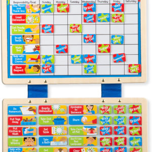 Catch children in the act of behaving well and reward them, then watch those good habits multiply! Open the fabric-hinged boards to reveal a behavior chart on one board, while the other board keeps all the magnets close at hand. A sturdy cord is attached for hanging. Dry-erase board and 90 magnets, including responsibilities, positive behaviors, and rewards.